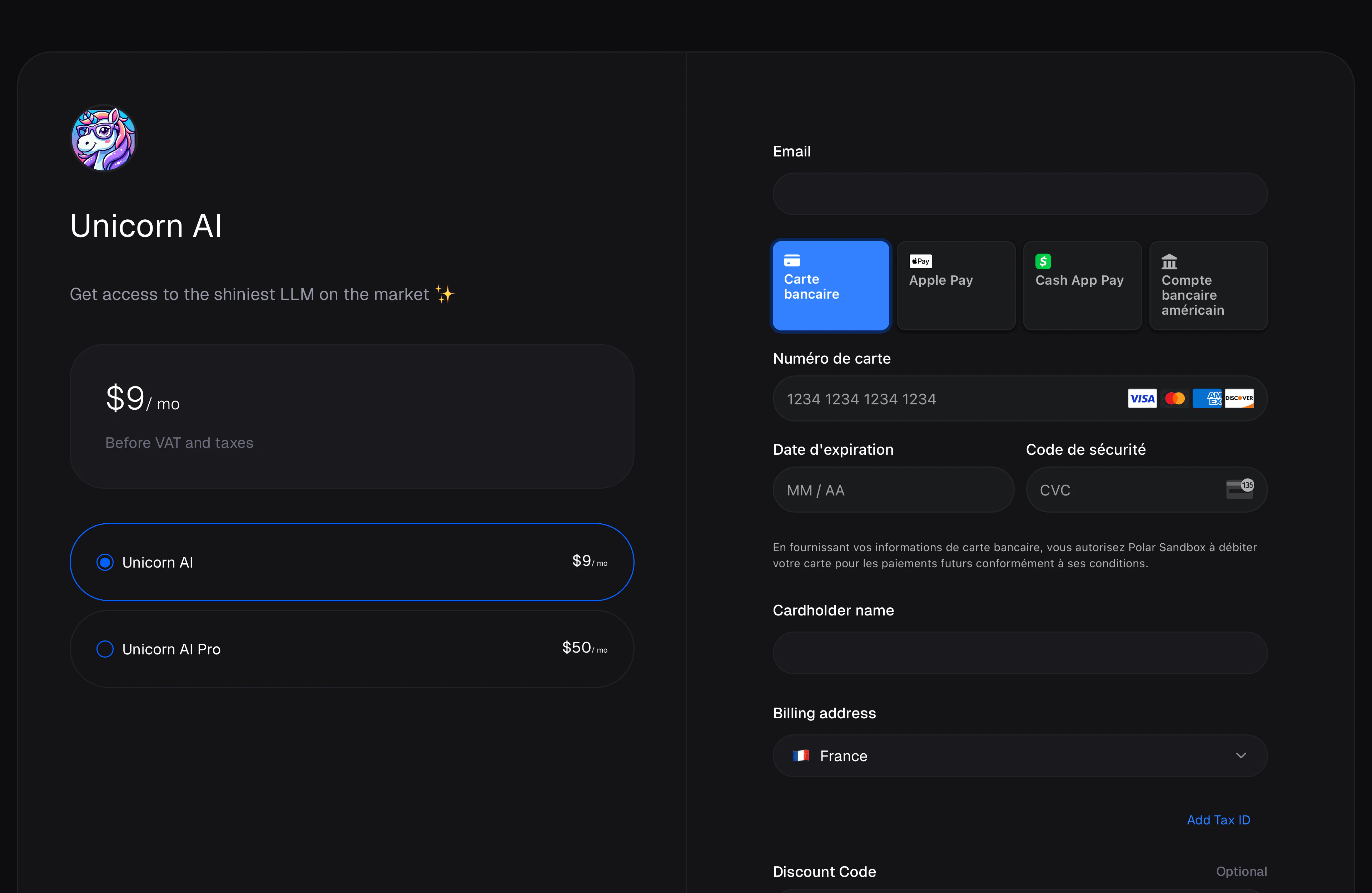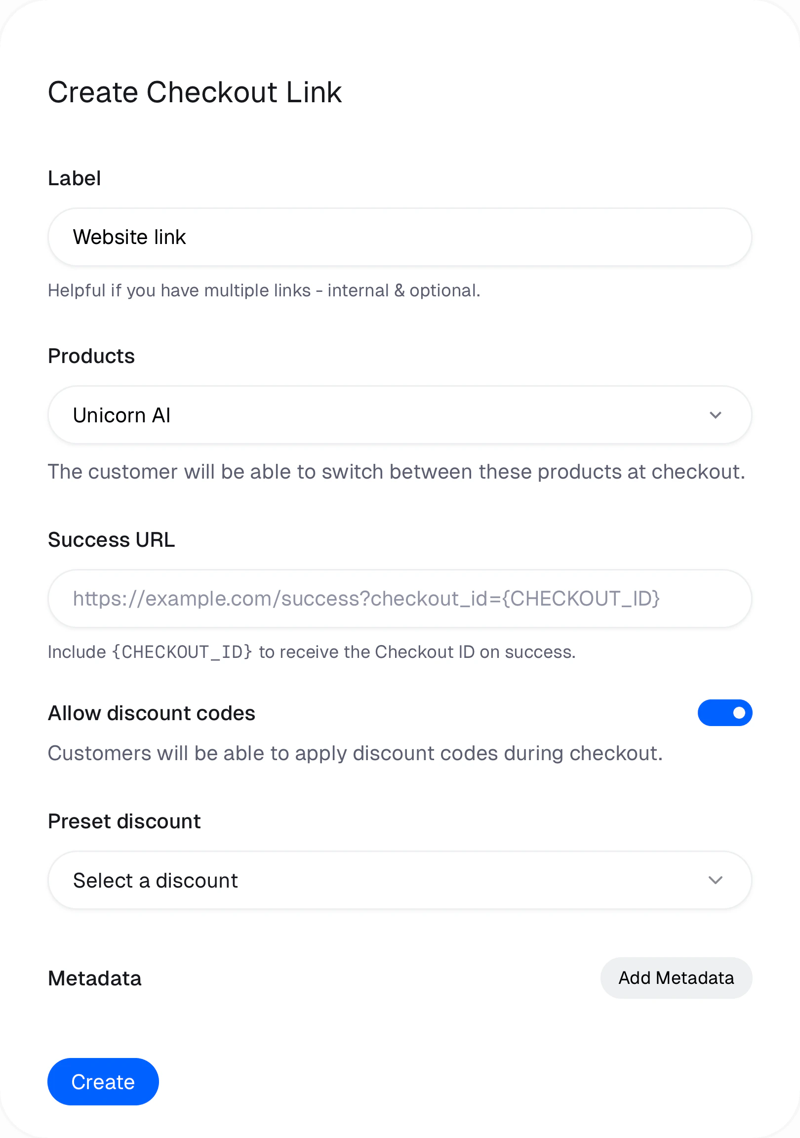 You can preset a discount on the Checkout Link: it will be automatically applied when the customer lands on the checkout page — no action needed from the customer. This is particularly useful for running promotions or offering special pricing through specific links. If Allow discount codes is enabled, customers can still manually enter other discount codes during checkout, even when a discount is preset.Metadata