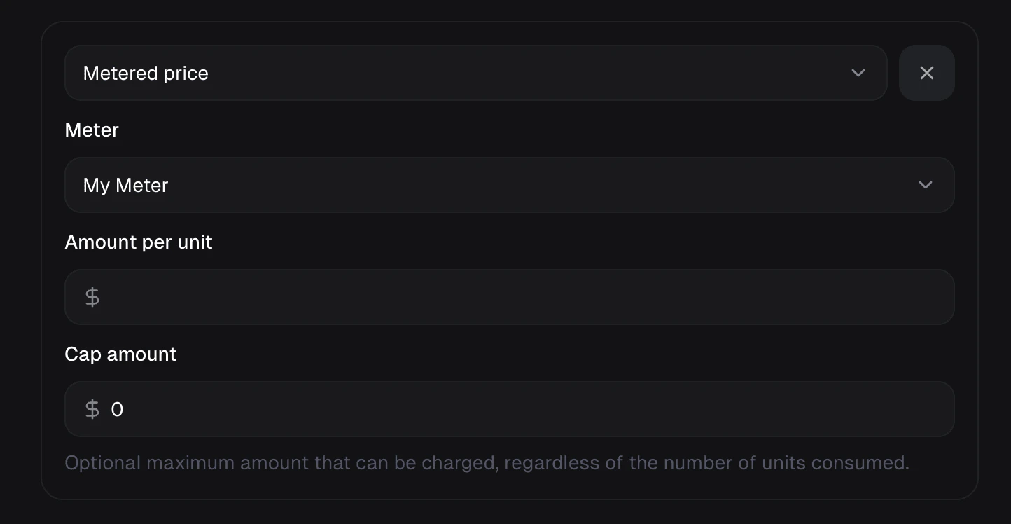 To charge your customers for usage, you need to add a metered price to your product. You’ll need the select the Meter and the amount per unit.