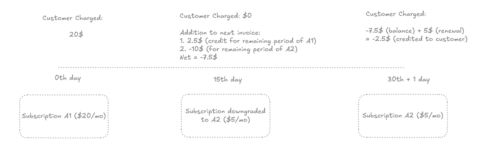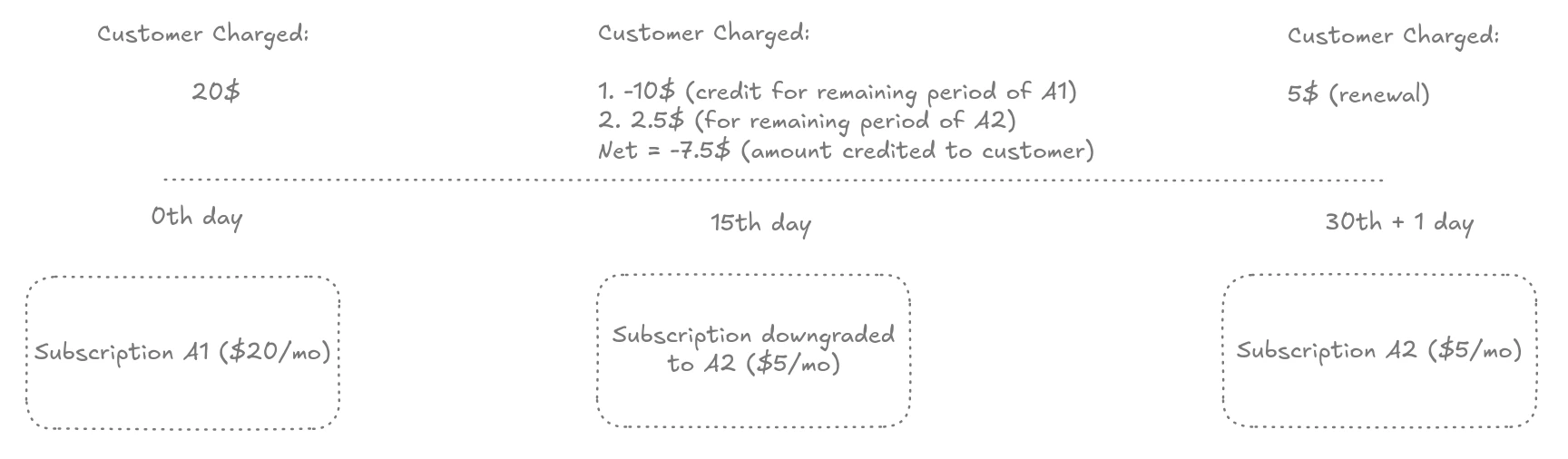 You can downgrade a subscription by following the steps outlined in Subscription Downgrades, which explains the process from both the merchant’s and the customer’s perspectives. Example 1: Proration type =invoice