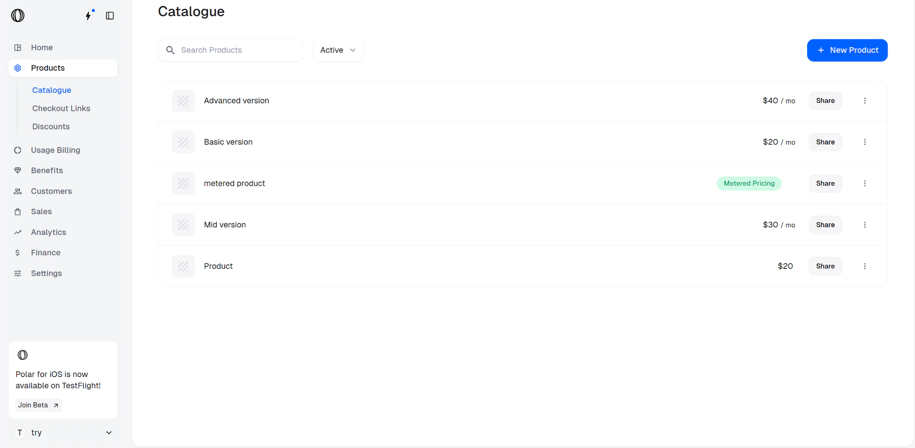 - In the Polar dashboard sidebar, navigate to Products > Catalogue for your organization.