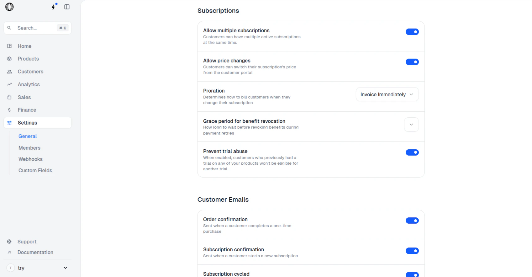 https://polar.sh/dashboard/${org_slug}/settingsScroll down to Subscriptions section.