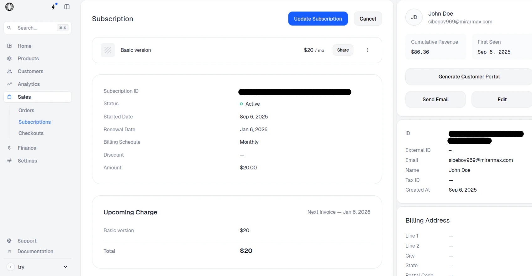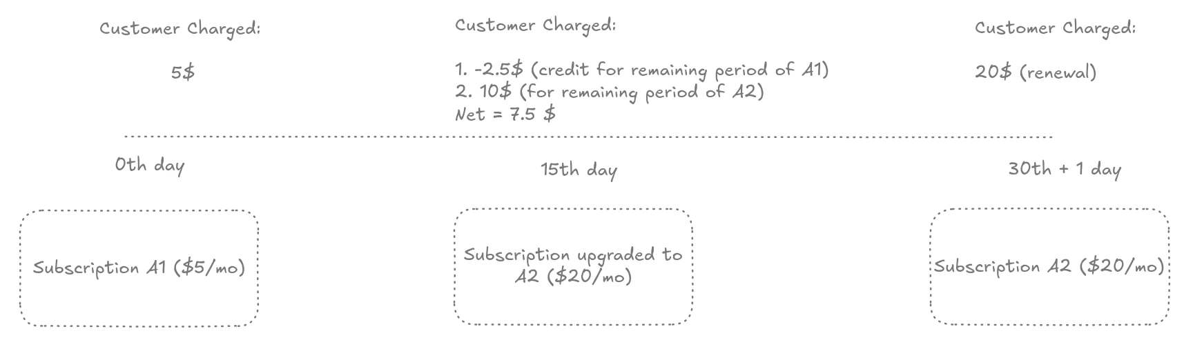 You can upgrade a subscription by following the steps outlined in Subscription Upgrades, which explains the process from both the merchant’s and the customer’s perspectives. Example 1: Proration type =invoice
